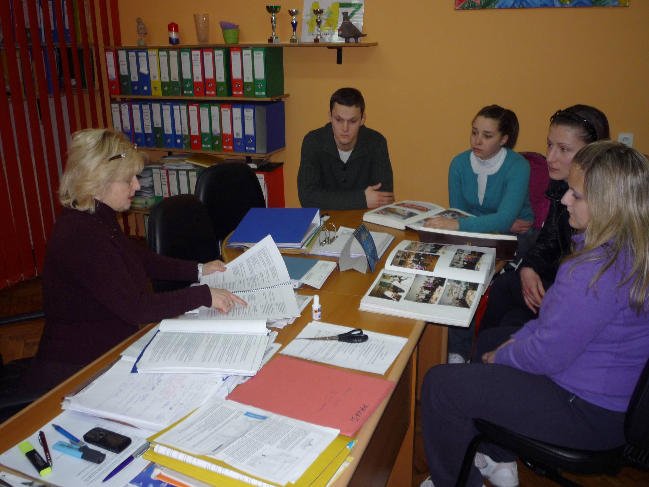 Ravnateljica Branka Sironić i pedagog Saša Jureša su vrijednim studenticama i budućim učiteljicama (našim bivšim učenicama) Ivi, Morani i Karmen prikazali rad škole.